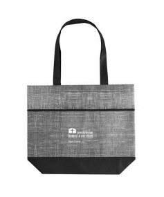 Constructed of 70gsm Non-Woven Polypropylene. Features denim look. 5" bottom gusset, 3 front pockets, and 25-1/4" handles. Complies with Prop 65. 14" H x 16 3/4" W x 5 1/4" D