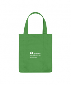 Made Of 80 Gram Non-Woven, Coated Water-Resistant Polypropylene. Great For Grocery Stores, Markets, Book Stores, Etc. 10" Gusset With Matching Covered Bottom Insert. Reusable. 20" Handles. Spot Clean/Air Dry. Complies with Prop 65. 13" W x 15" H x 10" D