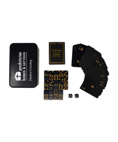 Pass the time with our portable games kit! Included in this customizable gift tin are luxe dominoes, dice, and playing cards. This kit is easy to bring with you on road trips or flights for games night no matter where you are. 4.1" W x 6.7" L x 3.2" H
